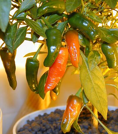 Pods at different stages of maturity. I just love these "bonsai-shaped" peppers, you can have so many varieties with rather small space! :)