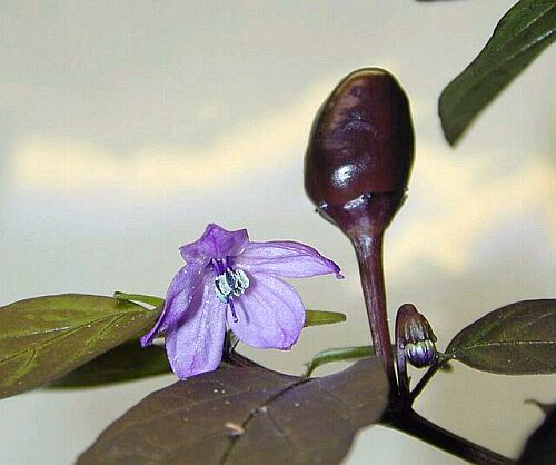 Immature pod and flower. Thought to be a wild variety. Perhaps the mother of all purple ornamental varieties.