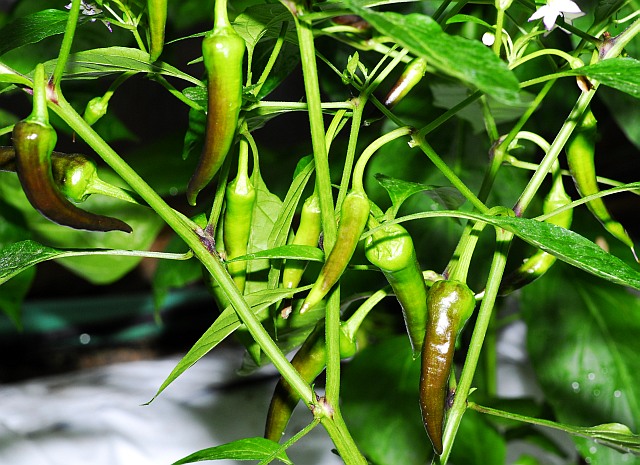 Immature pods forming. Darkened by the strong sunshine. Originally classified as C. sp but it´s clearly an C. annuum with purple edges on flowers.
