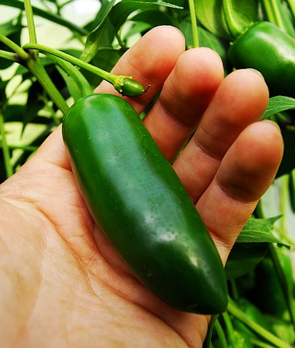 Immature pod. Very tasty Jalapeno variety. Medium heat. Soon it's time to start canning!