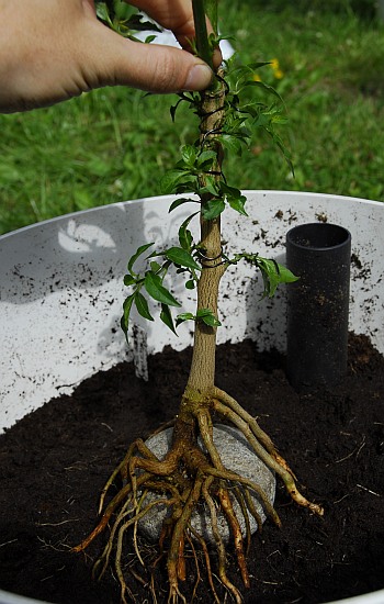 After wiring some small branches. The short branches will grow longer and get woody later when the plant is cut much shorter. I think I`ll cut the plant just above where my thumb is on the picture. I can already see the final result in my mind.