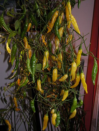 Maturing pods. Heavy and continous bearer. This invidual is almost 5 years old. Maybe not as continous bearer as it used to be, but still way above the average pepper.