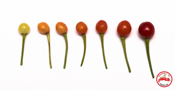 C. chinense var. 'Ojos de Pescado'Pods at different stages of maturity. This plant is very pretty when filled with these colorful pods. Besides being beautiful, it's also very tasty, actually one of the best habanero-relatives I know. Has a nice heat level to boost up any food!