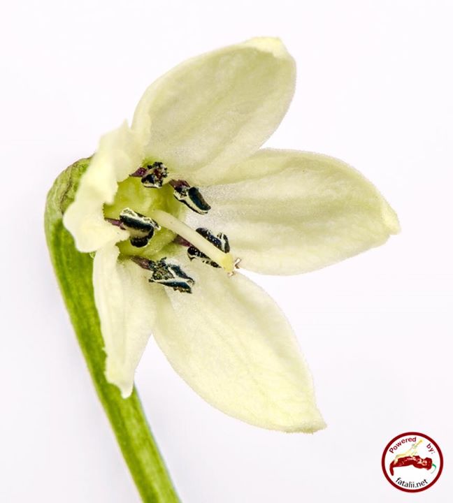 C. chinense 'Harold StBarts'. Close-up of a flower. This very hot chile pepper variety belongs to a group of Habaneros. The taste is amazingly good and it always produces great yields. Small pots will do fine for a decent yield, but for maximum yields, I would definitely recommend a huge pot for this one. :) Seeds available: http://fataliiseeds.net/search?query=harold