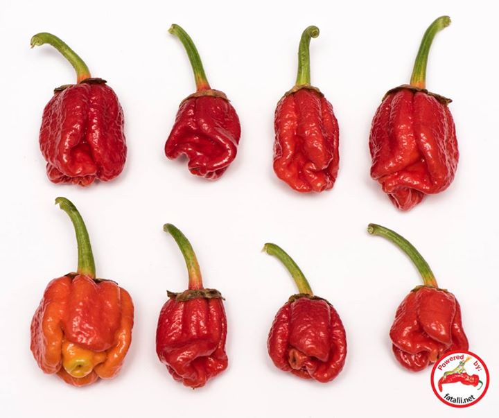 This unusual variety of 7pot ripens also the stems to red color, partially or fully. Seems to be more stable variety than many other new super hots are. Very pretty. :)