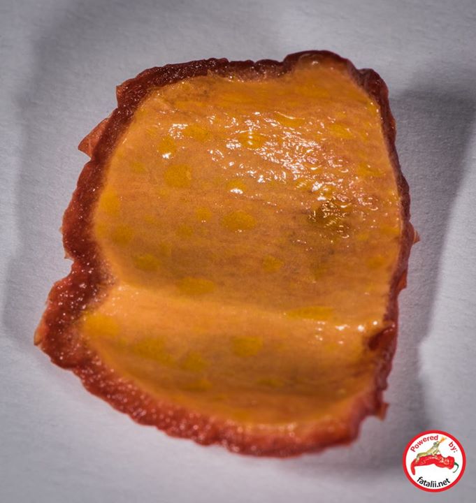C. chinense 'Carolina Reaper' x 'Chocolate Scorpion' A slice of this extremely hot pod shows the capsaicin drops. Check out the hottest chile pepper varieties here: http://fataliiseeds.net/search?query=hot&sort=hot