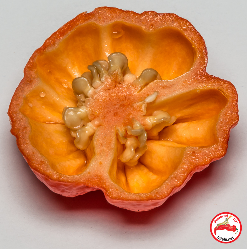 C. chinense var.This is where we have come to. Our breeding project resulted a chile pepper which is way too hot even for the toughest naga-eater. I learned to be afraid of this one very soon after tasting it. CAUTION! EXTREMELY HOT! Not recommended for eating as it is. Just look at the white capsaicin gland area inside. The whole pod is covered with capcaisin drops.