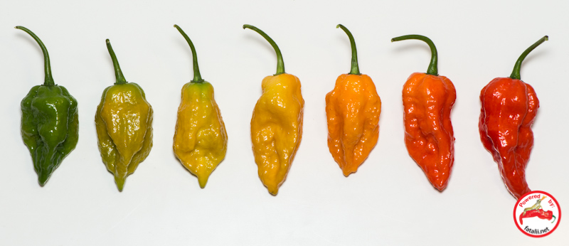 Maturing pods. Great, super hot variety. Bigger and more wrinkled than typical nagas.