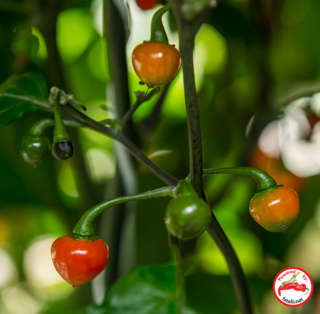 Maturing pods. Very beatiful plant! Dark leaves and compact shape with multicolored pods make this one a catch. Heat level is above average and it's combined with a nice exotic taste.