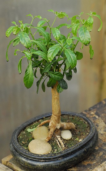 Growing in the greenhouse. I will plant this one to much larger pot until autumn, when it will be cut down to a bonsai chile again for overwintering, very practical and fun! :)