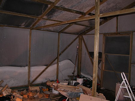 A view from inside the greenhouse. The cold side of the greenhouse is excellent place to work when it gets too cold & bad weather outside! Lots of space for the projects.