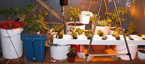 Table in the warm side of the greenhouse. Plants growing in both: hydroponics and soil.
