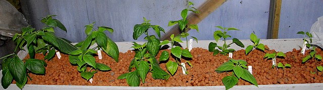 Seedlings growing in EBB & flood hydroponic system at the warm side of the greenhouse. Later they will be moved into soil or other hydroponic systems.