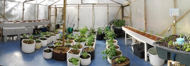 Cold side of the greenhouse. Starting to fill with young plants. The biggest pots in the picture are from 80L to over 100L in capacity.