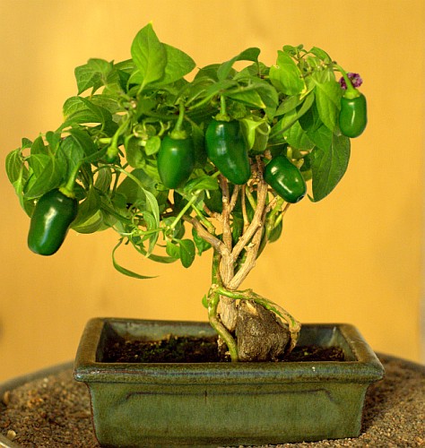 A Rocoto Bonsai Chile on my mother´s windowsill. It never got any artificial light, just sun, started during the early winter last year. Very nice looking plant. This plant wasn´t cut down as the bonchi plants usually are, it still works well, but if you want to get a thick, nice looking stem, you should cut the bonchi from the large plant. Check instructions here: http://fatalii.net/bonchi Seeds for chile peppers here: http://fatalii.net/seeds