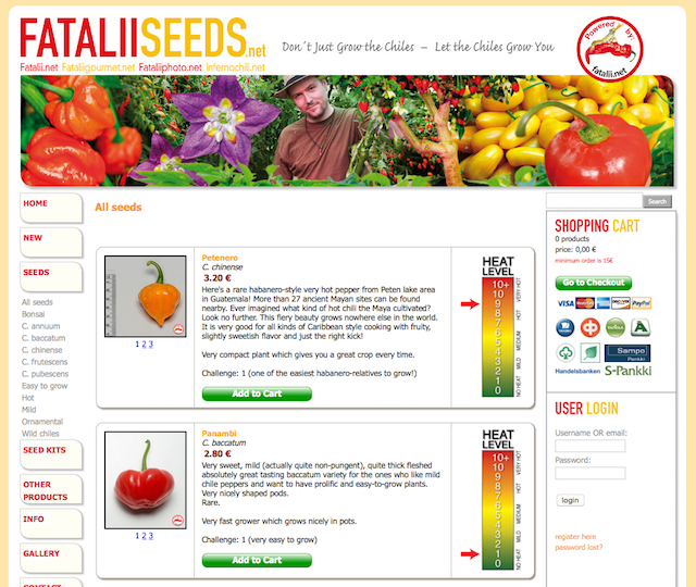 Heat levels added tohttp://fataliiseeds.net due to feedback of users. Check it out here: http://fataliiseeds.net/all-seeds?random=1 Notice that by click the "Seeds" button on the left menu of fataliiseeds.net you will get a list of varieties in random order, which you can randomize again whenever you like, by clicking the "seeds" button again. This helps you to get some ideas what to grow. By clicking the "all seeds" menu item under the "Seeds" category you will get the list on alphabetical order. Hope you like it!