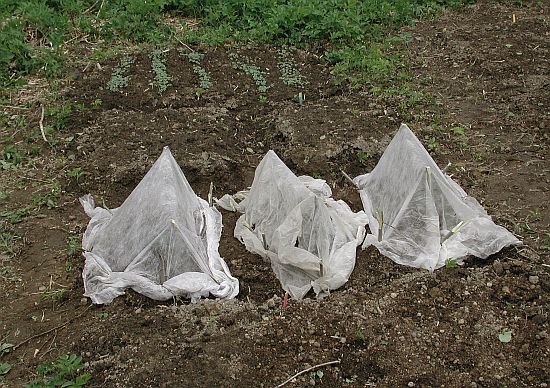 Seedlings planted in a kitchen garden. Sheltered with lace-cloths.
