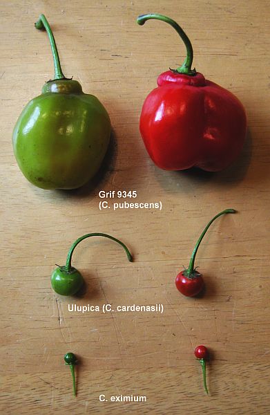 Different types of pods from the different species. However, they are all still closely related. - Grif 9345 (C. pubescens) - Rocopica (C. cardenasii x pubescens) (mislabeled as "ulupica" back then) - C. eximium