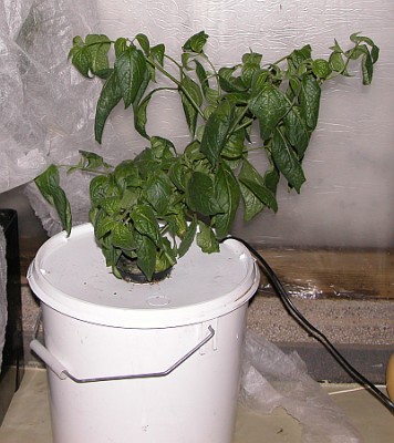 Rocoto in 15L hydroponic system in a greenhouse. These are very easy to build, just bucket with lid and pump!