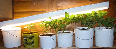 Rocotos getting ready for the greenhouse! Notice how close to the plants the fluorescent tube is.