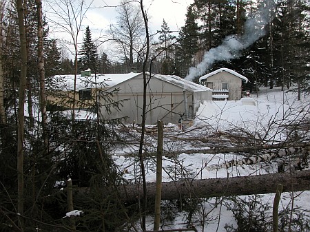 A view from back of the greenhouse. Big trees on the ground to be chopped for the furnace.