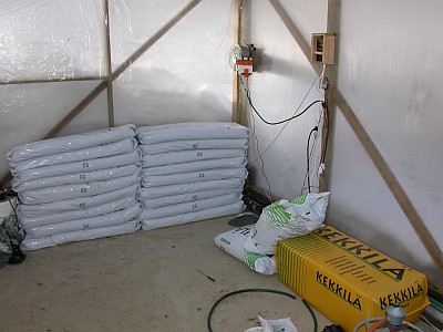 Bags of soil. The yellow bag contains 320 liters of peat. Long sowing sacks have a really good shape for this greenhouse!