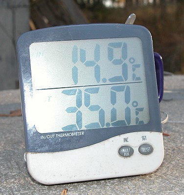 Day 9. Testing the oven. Temperatures in degree celsius, above is the temperature outdoors and below is the temperature in the smoking oven, where the chiles are. Perfect!