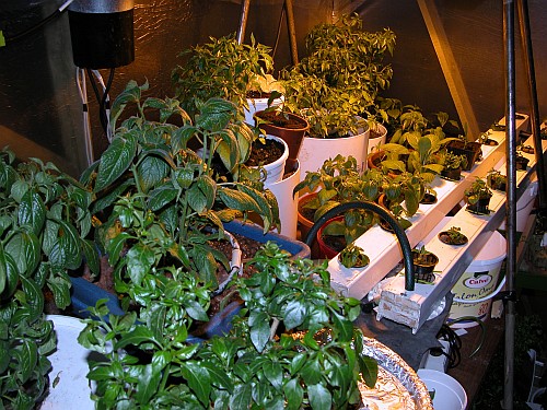 Table in the greenhouse. Mostly seedlings and hydroponic systems on this table.