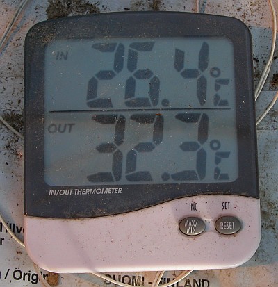 Meter on a warm side at evening. "In" temp is air temperature, and "out" is the temperature of the soil in a growing sack.