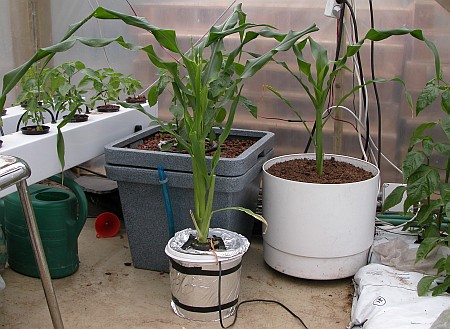 On the right: corn growing in soil. On the left: corn growing in 5L bucket (homemade hydroponic system).