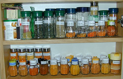 A growing selection of powdered peppers. Mostly different varieties on lower shelf and mixed peppers and other home-grown spices on upper-shelf.