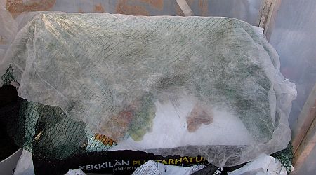 New seedlings in a bag of soil. Covered with netting and two layers of lace-cloth.