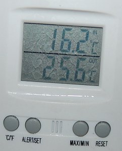 Temperature at night time. Upper is the temperature of the air in the greenhouse. The "out" temp is the temperature of the soil.