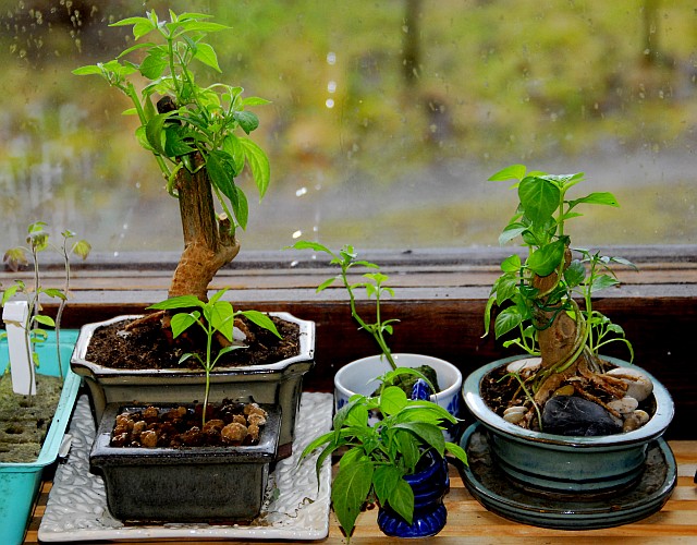 My dear mothers windowsill. She really likes to grow chiles like this! And she definitely got the green thumb too! I look forward to see more bonsai chile results...