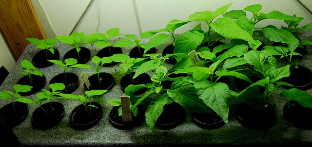 Bhut Jolokias and Naga Morich -seedlings growing in a cuttingboard! They will be planted to a large EBB & flood system later.