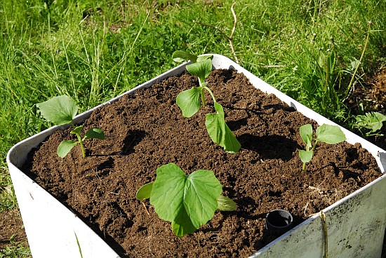 Couple of melons and pumpkings growing in large pot outside.