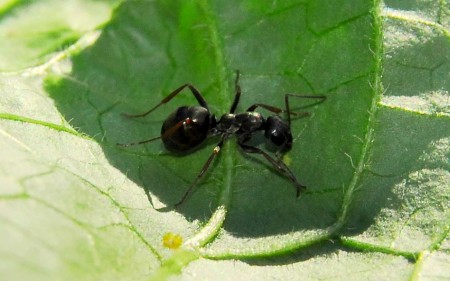 Ant sucking honeydew from small aphid. If you spot lots of ants on your plants, it might mean they are carrying aphids to your plants! They also protect aphids from predator insects.