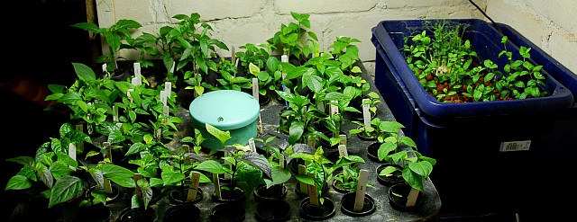 Chile plants growing on rainforest (left) and mint growing on homemade EBB & flood system on the right.