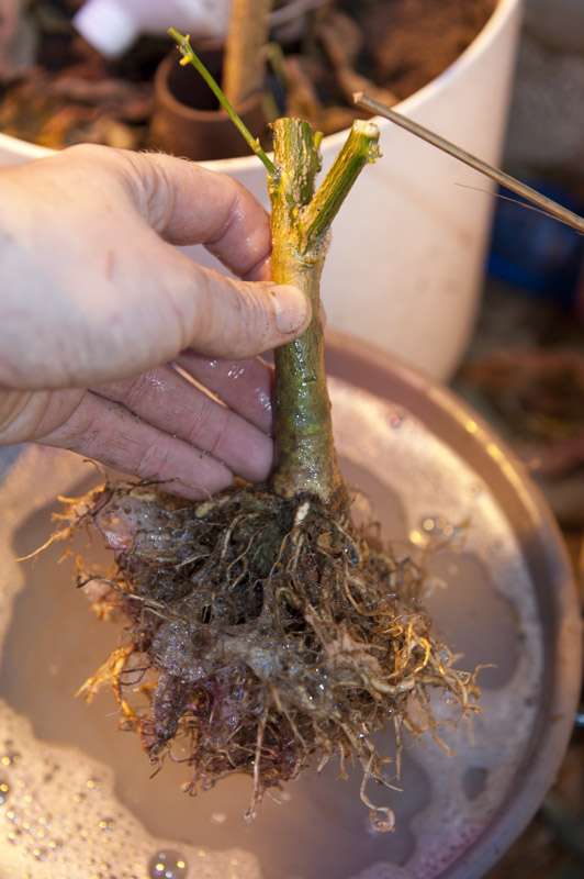 About to dip the bonchi stem into the pinetree soap solution. This will suffocate all the possible pests before planting bonchis indoors.