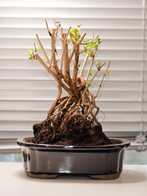 Goji berry turned into a bonsai. Just started forming growth.