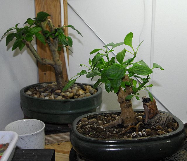 Bonsai chiles!Rocopica (C. cardenasii x pubescens) and Dutch Habanero (C. annuum x chinense).