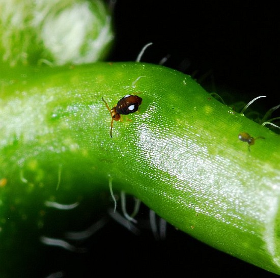 A tiny bug climbing up on a C. praetermissum plant. I wonder what these could be...? For a good suggestion, drop me an email. I haven`t seen any harm they would have caused. I just notest they didn`t like neem oil... :)
