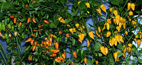 Pods maturing at the warm side of the greenhouse. From left to right: Pink Habanero, Dutch-Habanero F3 -variety, Fatalii.