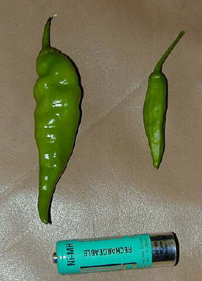 This shows two pods from same variety, one grown in greenhouse and one indoors on windowsill. The one grown greenhouse is both hotter and tastier!