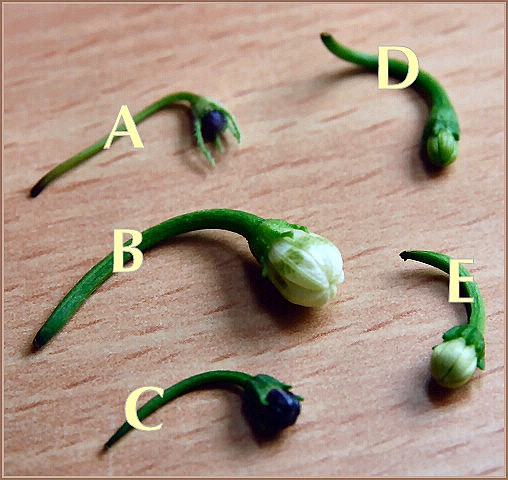 A - CGN 19198 (C. sp) B - Champion (C. baccatum) C - Locato (C. pubescens) D - Dutch-Habanero F3 (C. annuum x chinense) E - CAP 1473 (C. microcarpum (C.annuum))