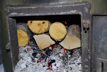 Hot embers from the previous burn will light up these pieces of wood quite easily... just convieniently before the heat will fade off from the heart off the furnace. This will ensure the temperature in the greenhouse will be suitable for the plants even in between the new batches of wood.