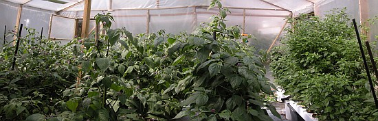 2.8.2005 Rocoto forest is taking over the cold side of the greenhouse. Hydroponic and aeroponic systems on the right side of the room.