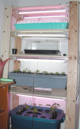 Hydro seedlings growing in compact shelf indoors. 1st shelf: seeds germinating 2nd shelf: cuttings rooting 3rd shelf: cuttingboard with seedlings and cuttings 4rd shelf: http://fatalii.net/growing/index.php?option=com_content&task=view&id=55&Itemid=69">Custom made aeroponic system with baccatum seedlings