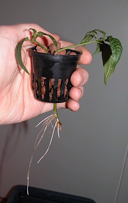 Locato (C. pubescens) cutting ready to be moved into waterfarm with a rockwool cube.
