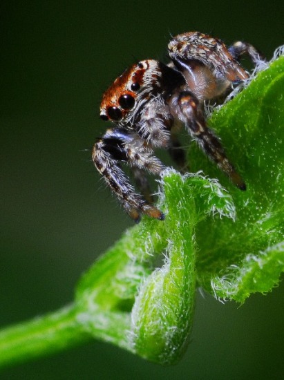 A funny fellow on chile plant jumping around! It spins it head around before jumping to check where to jump. :)